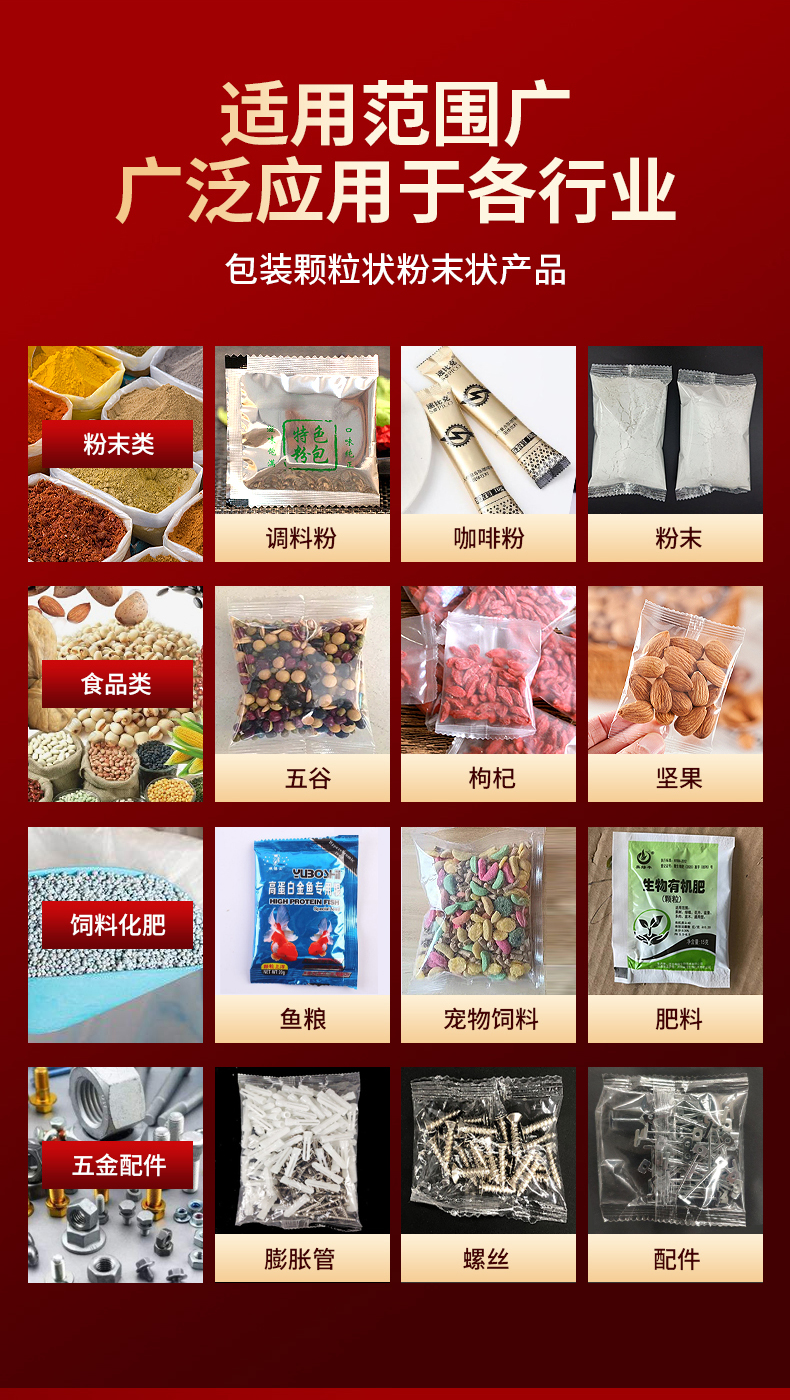 - 五谷雜糧、調(diào)味料、各種粉末、堅(jiān)果、零食、藥品、寵物飼料、種子化肥等各類顆粒粉末狀產(chǎn)品